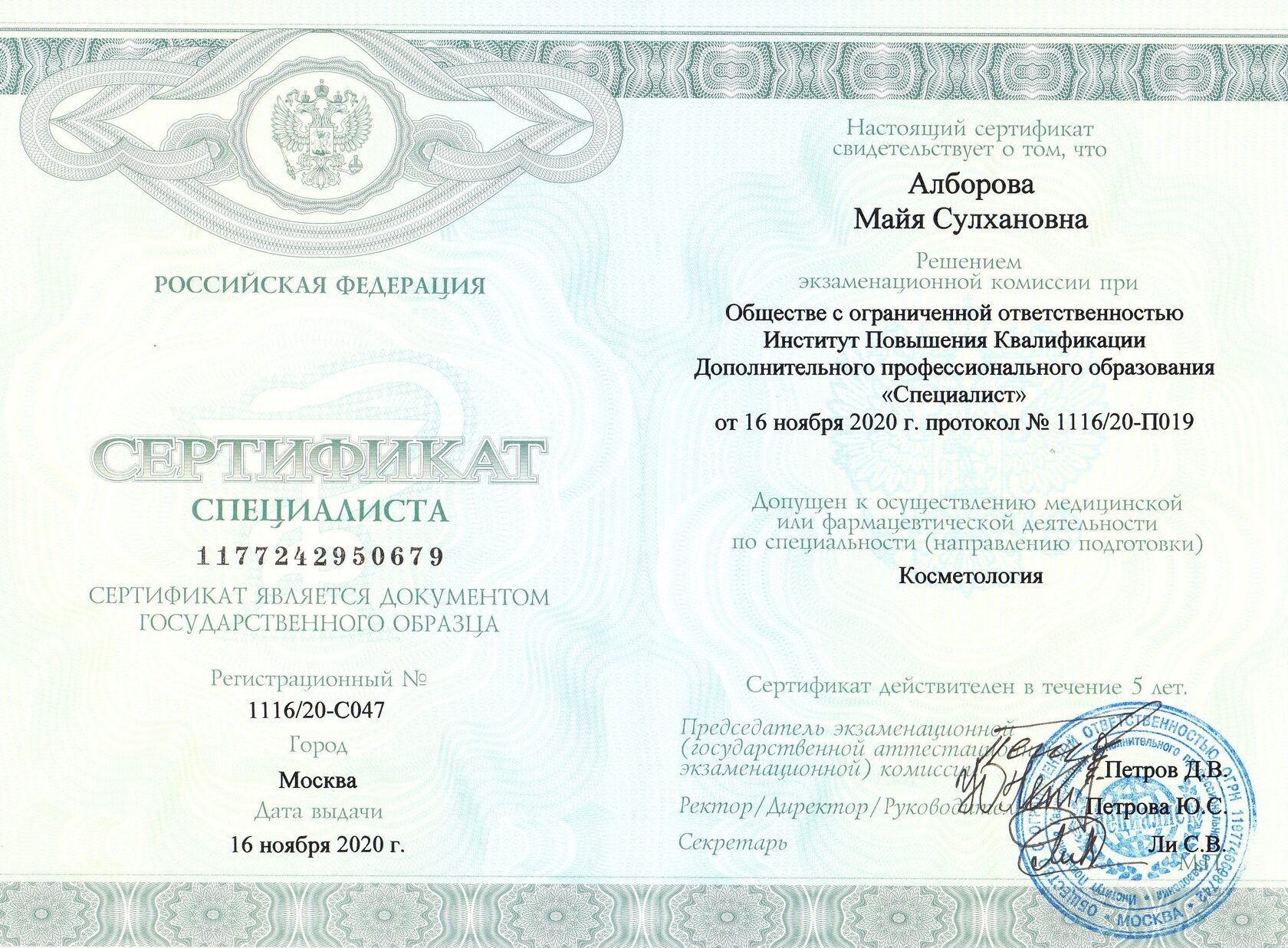 2016 г. - специализированный курс по направлению "Применение химических пилингов поверхностного и срединного действия для коррекции инволюционных изменений".